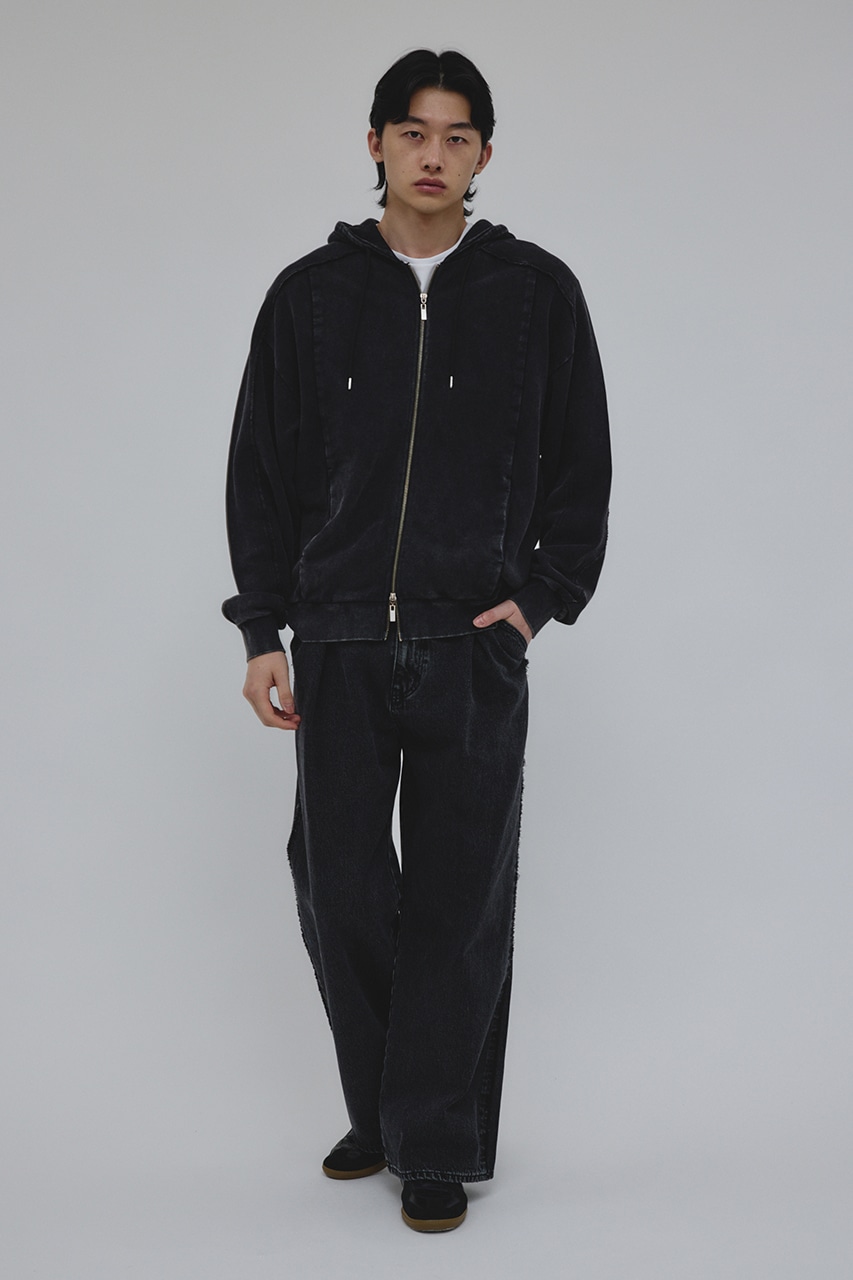 硫化染を施した厚みのあるコットン100%の裏毛ジップパーカー。ローエッジとフェードカラーで存在感のあるアイテムに仕上げた一枚。トレンド感のあるワイドシルエットがポイントです。ストレッチあり、透け感無し。
