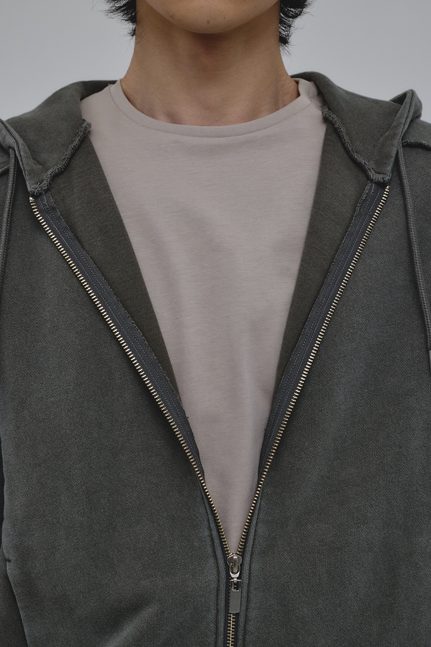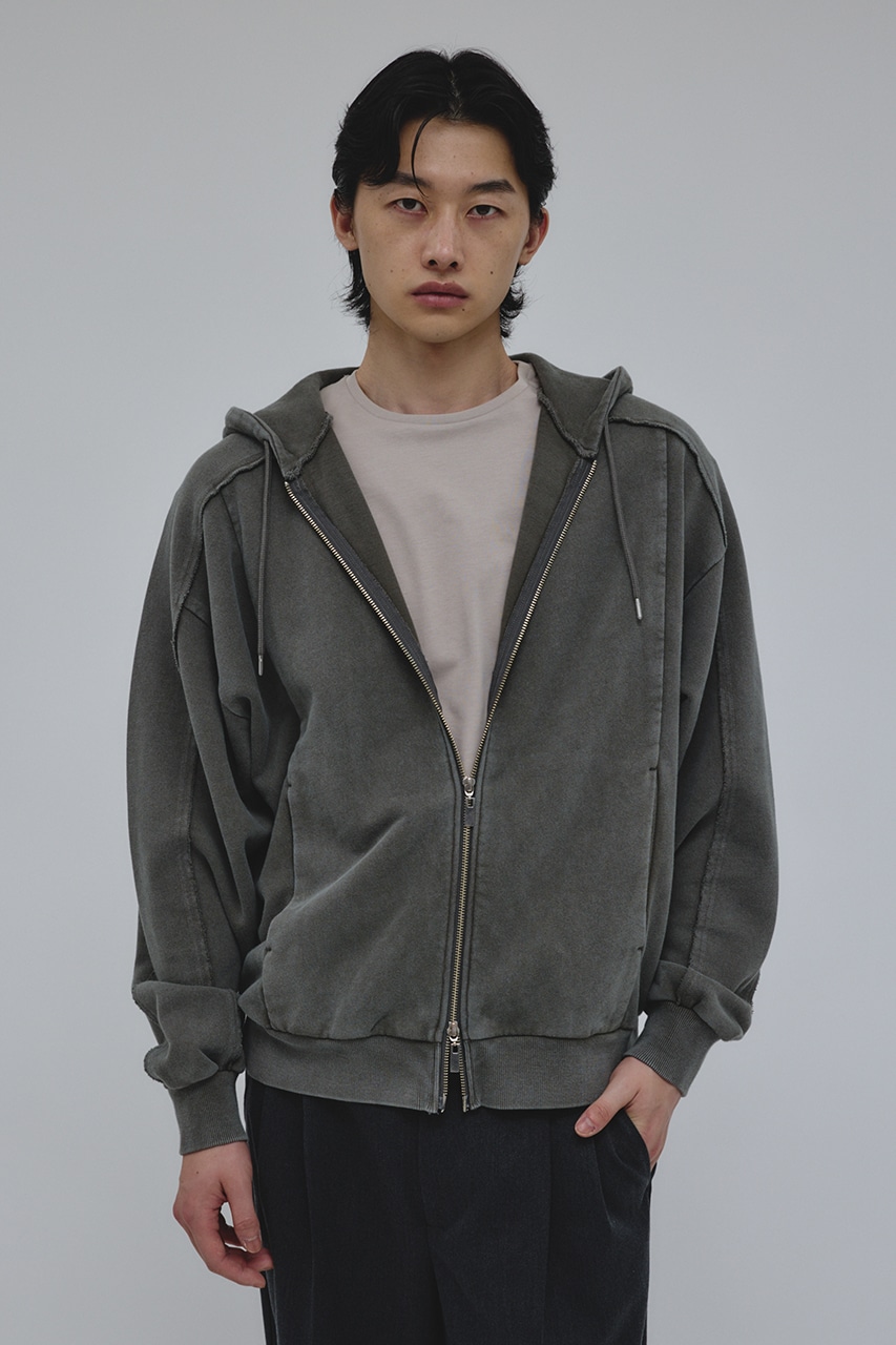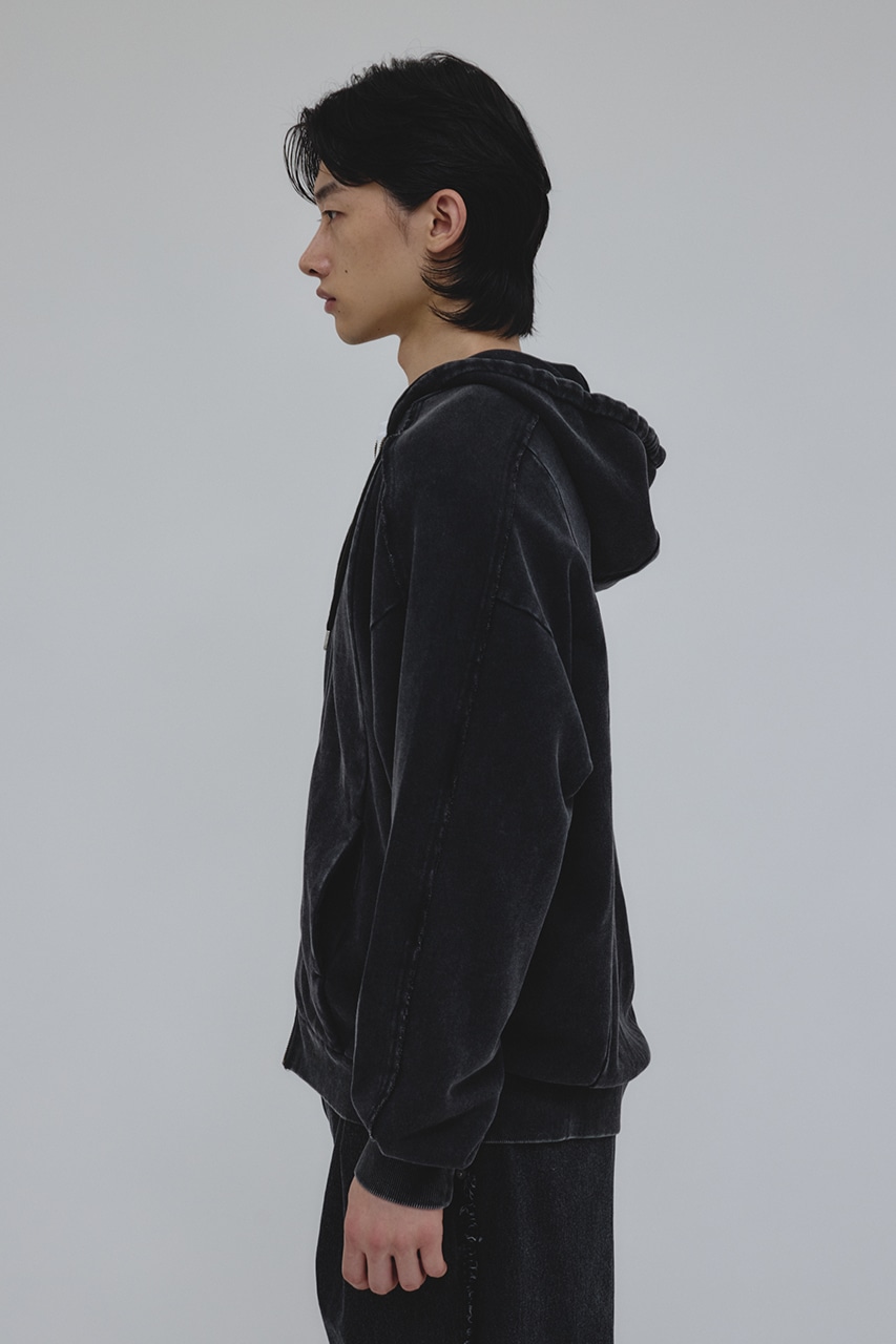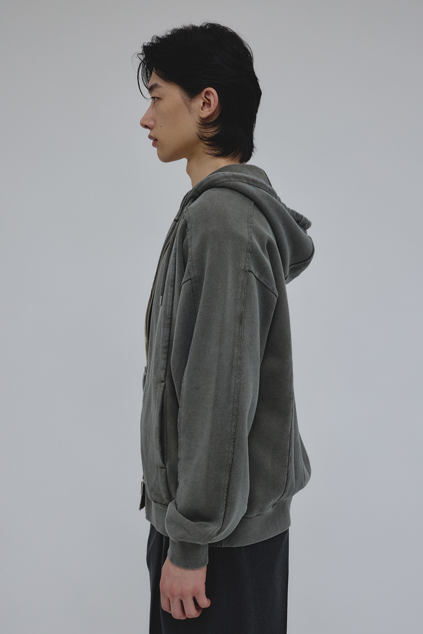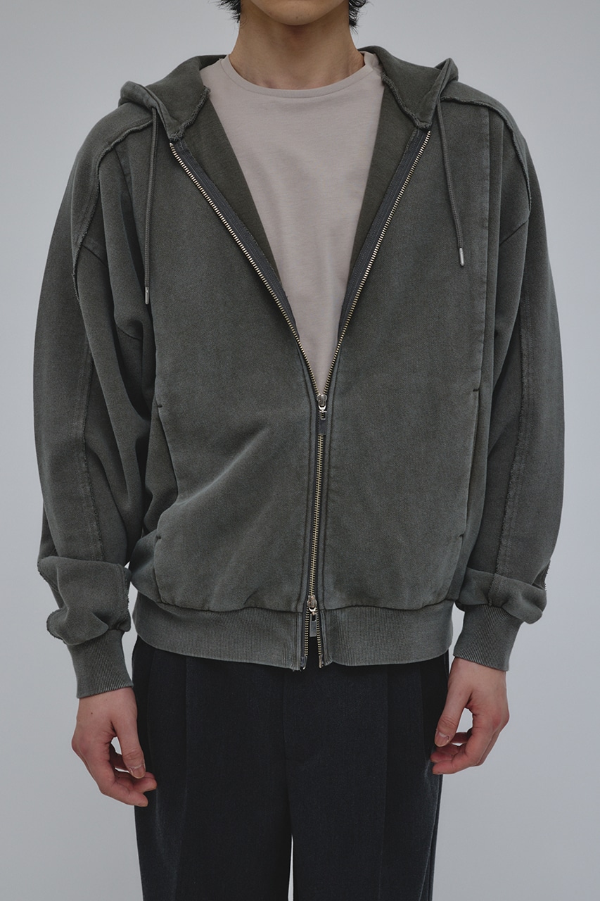 硫化染を施した厚みのあるコットン100%の裏毛ジップパーカー。ローエッジとフェードカラーで存在感のあるアイテムに仕上げた一枚。トレンド感のあるワイドシルエットがポイントです。ストレッチあり、透け感無し。