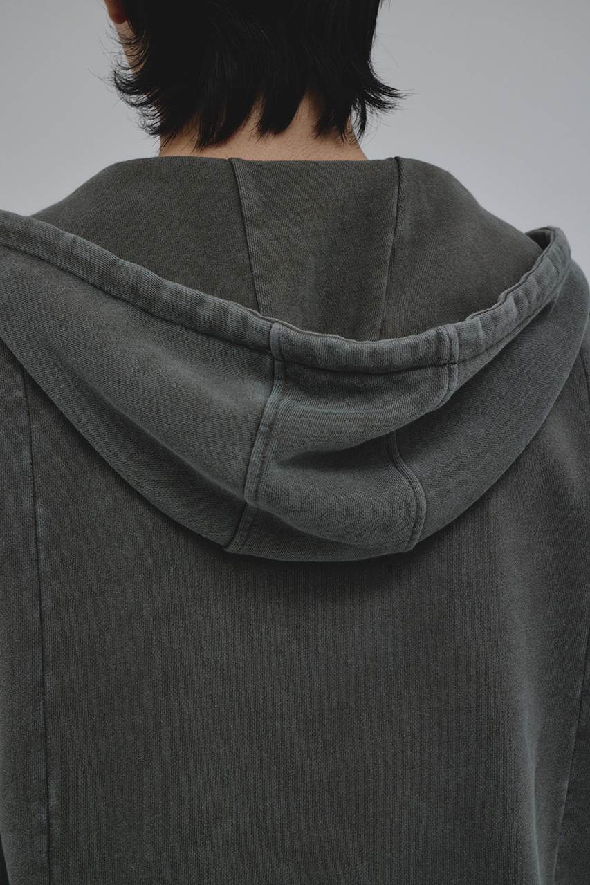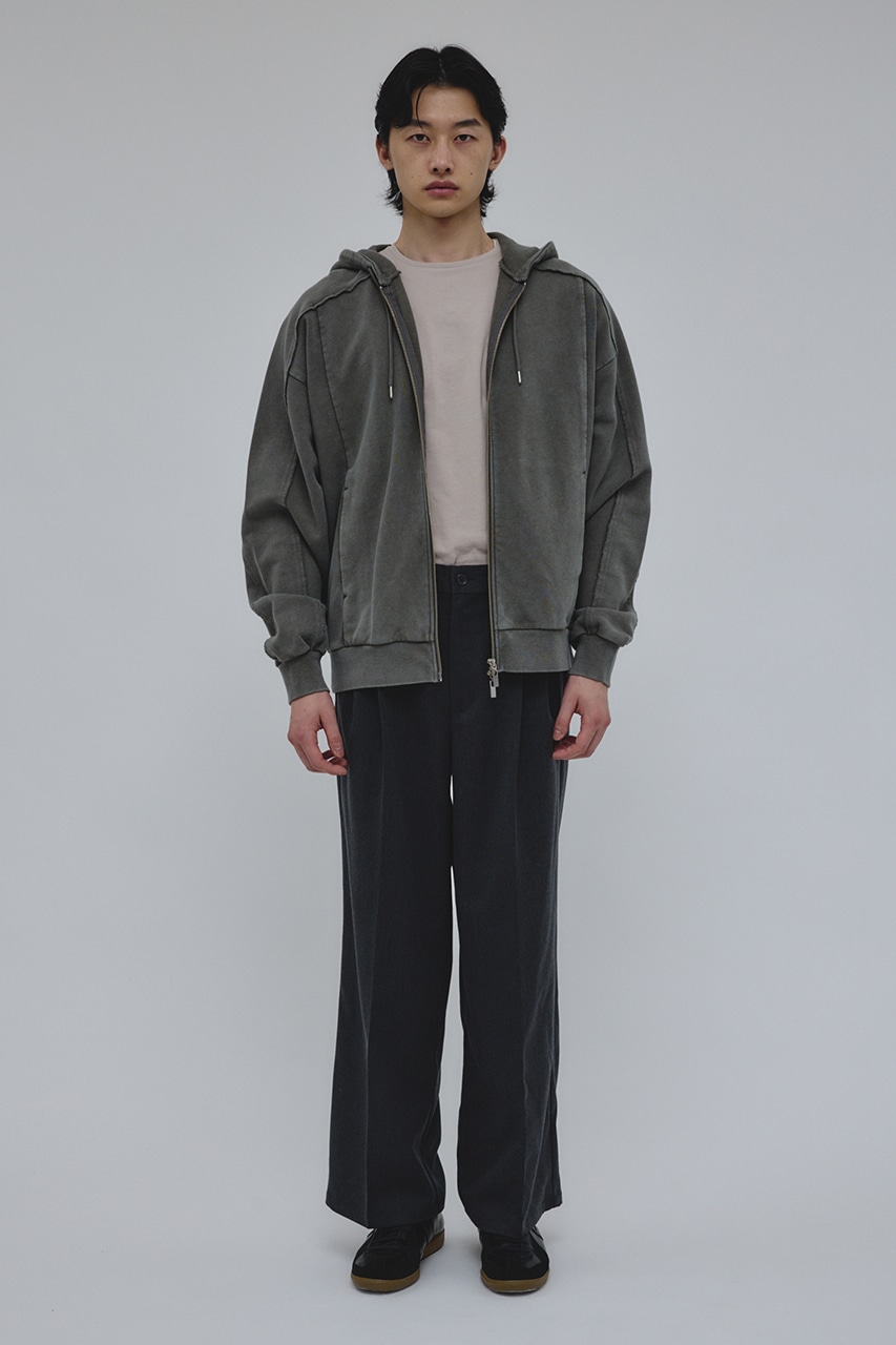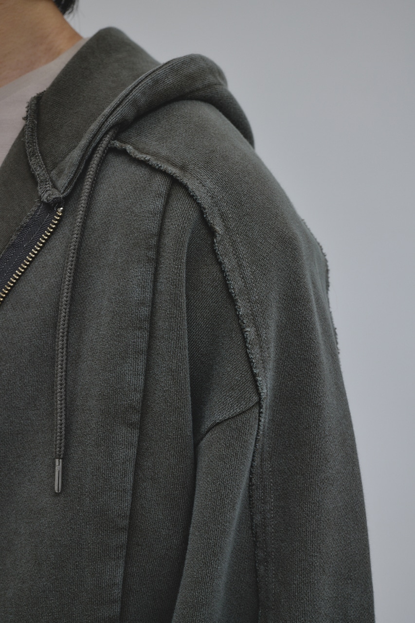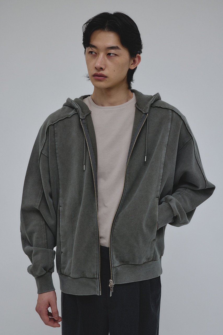 硫化染を施した厚みのあるコットン100%の裏毛ジップパーカー。ローエッジとフェードカラーで存在感のあるアイテムに仕上げた一枚。トレンド感のあるワイドシルエットがポイントです。ストレッチあり、透け感無し。