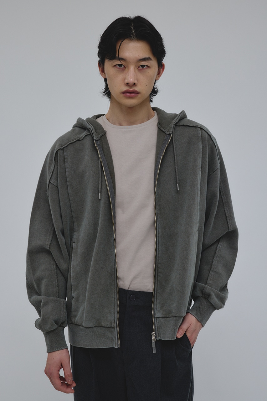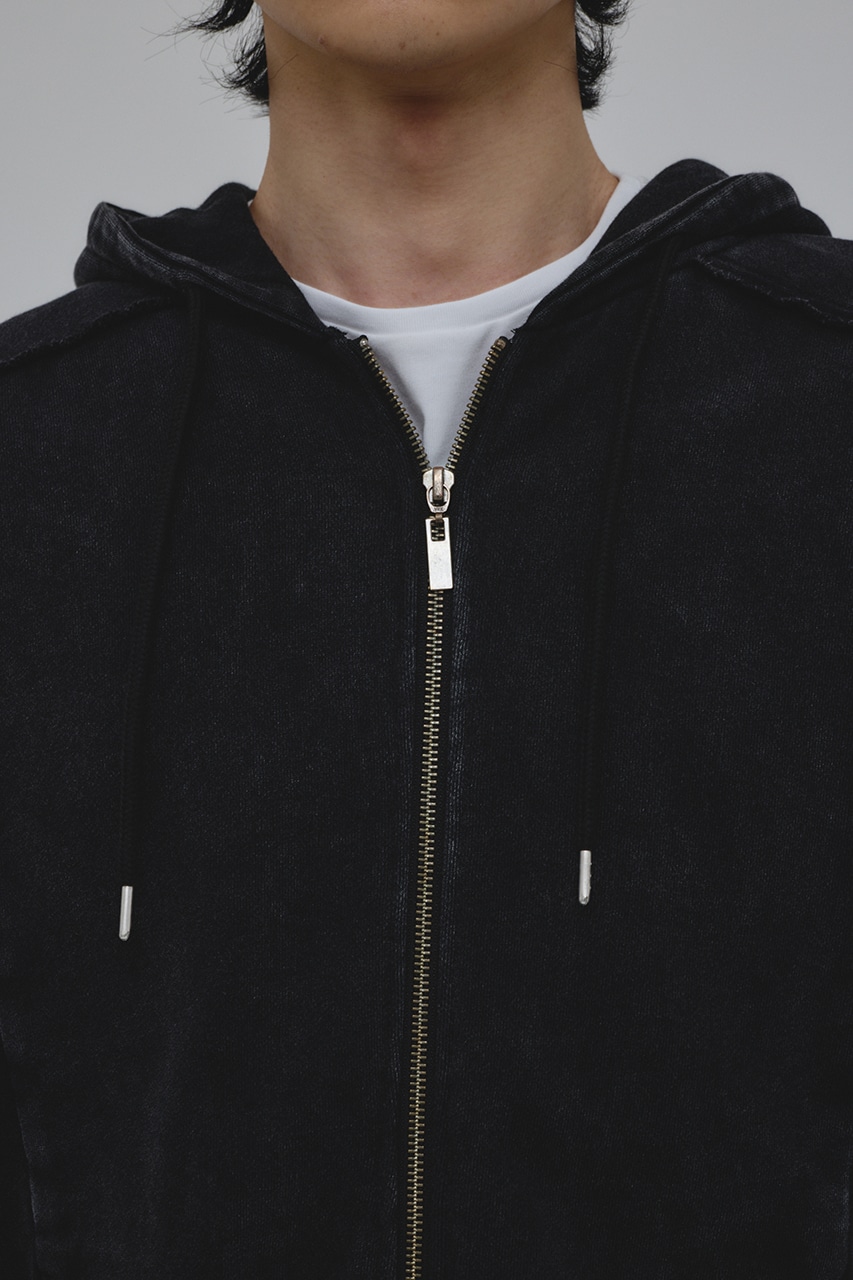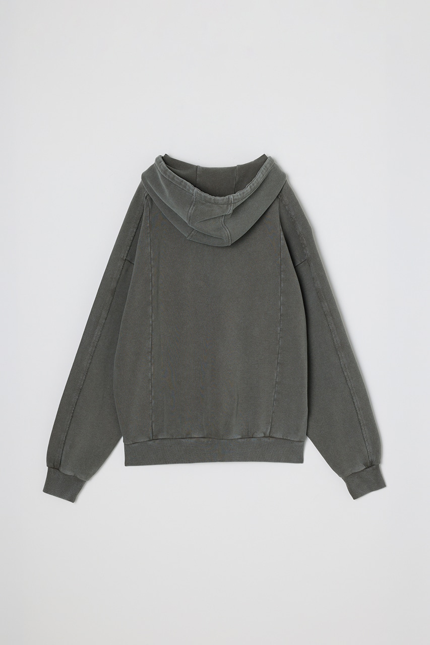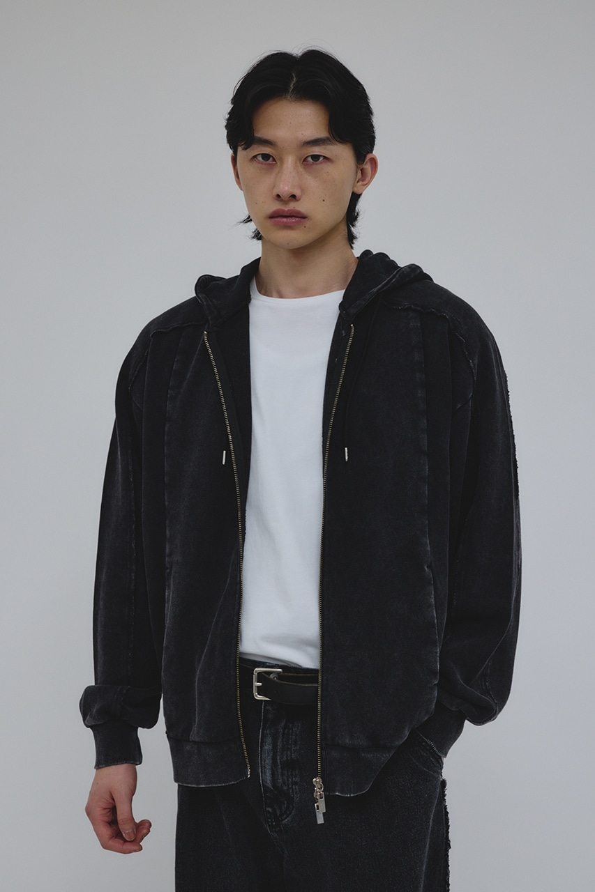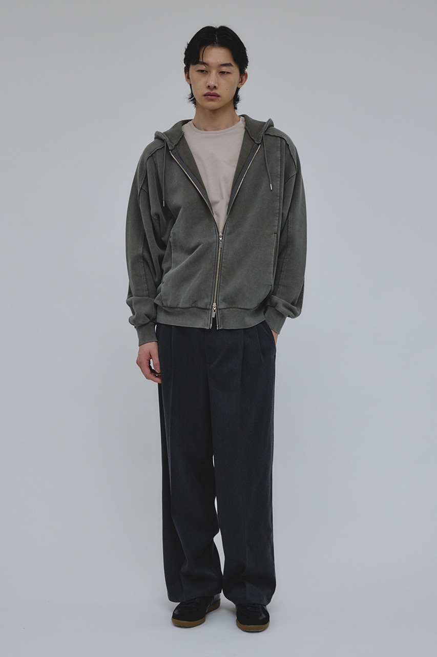 硫化染を施した厚みのあるコットン100%の裏毛ジップパーカー。ローエッジとフェードカラーで存在感のあるアイテムに仕上げた一枚。トレンド感のあるワイドシルエットがポイントです。ストレッチあり、透け感無し。