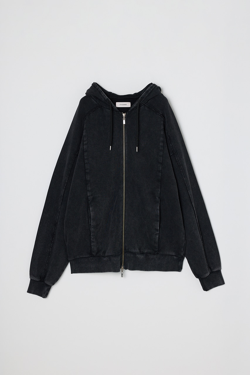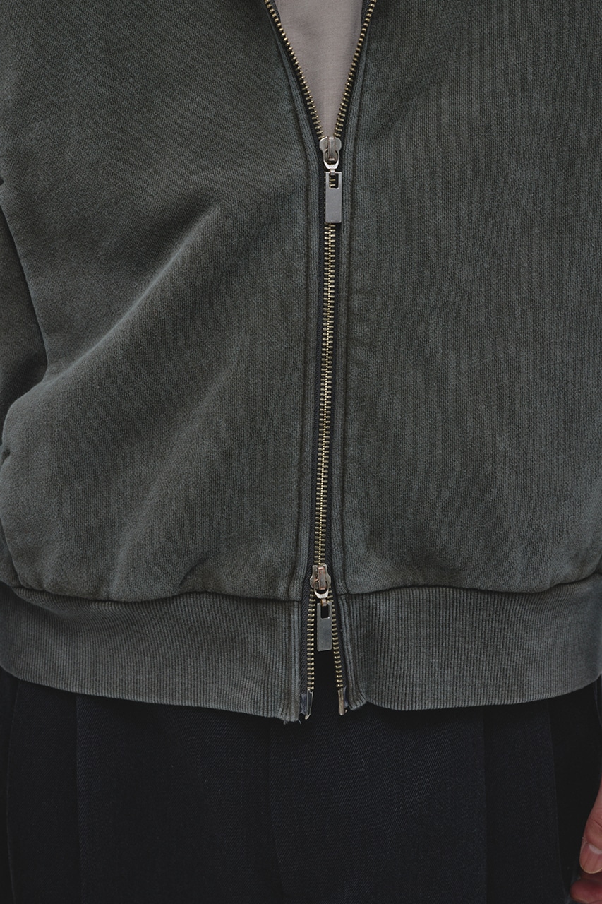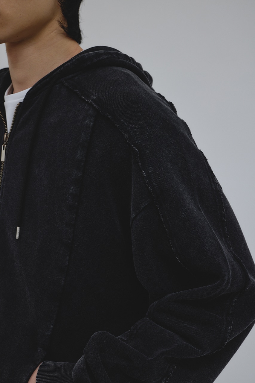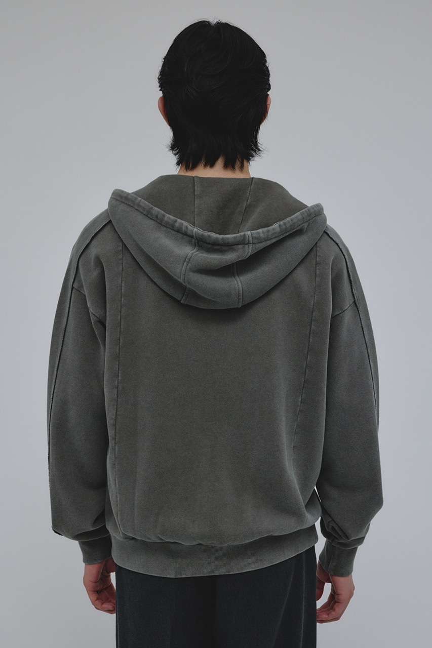 硫化染を施した厚みのあるコットン100%の裏毛ジップパーカー。ローエッジとフェードカラーで存在感のあるアイテムに仕上げた一枚。トレンド感のあるワイドシルエットがポイントです。ストレッチあり、透け感無し。