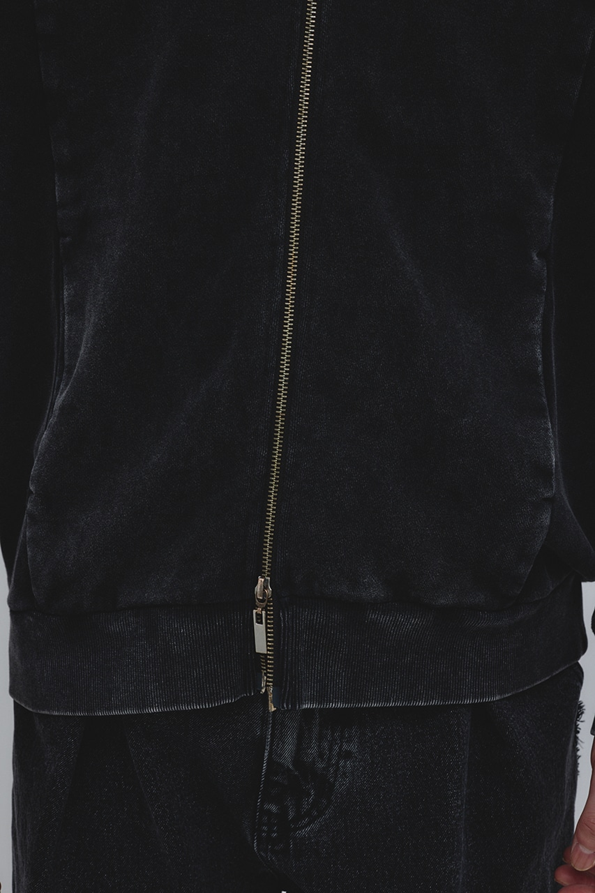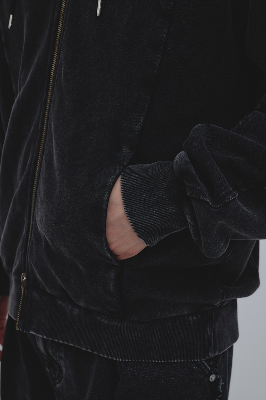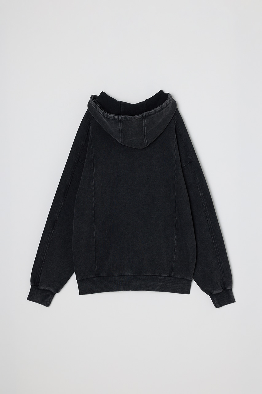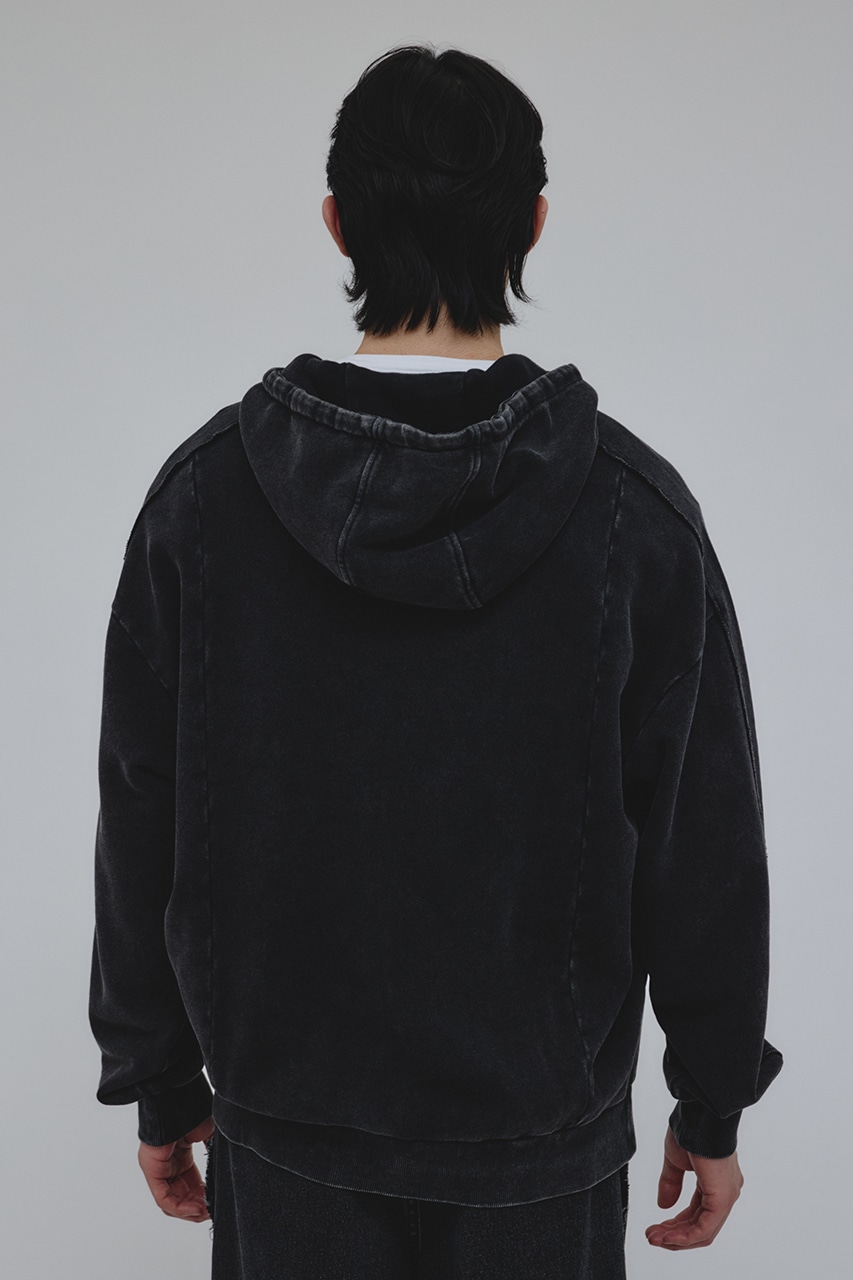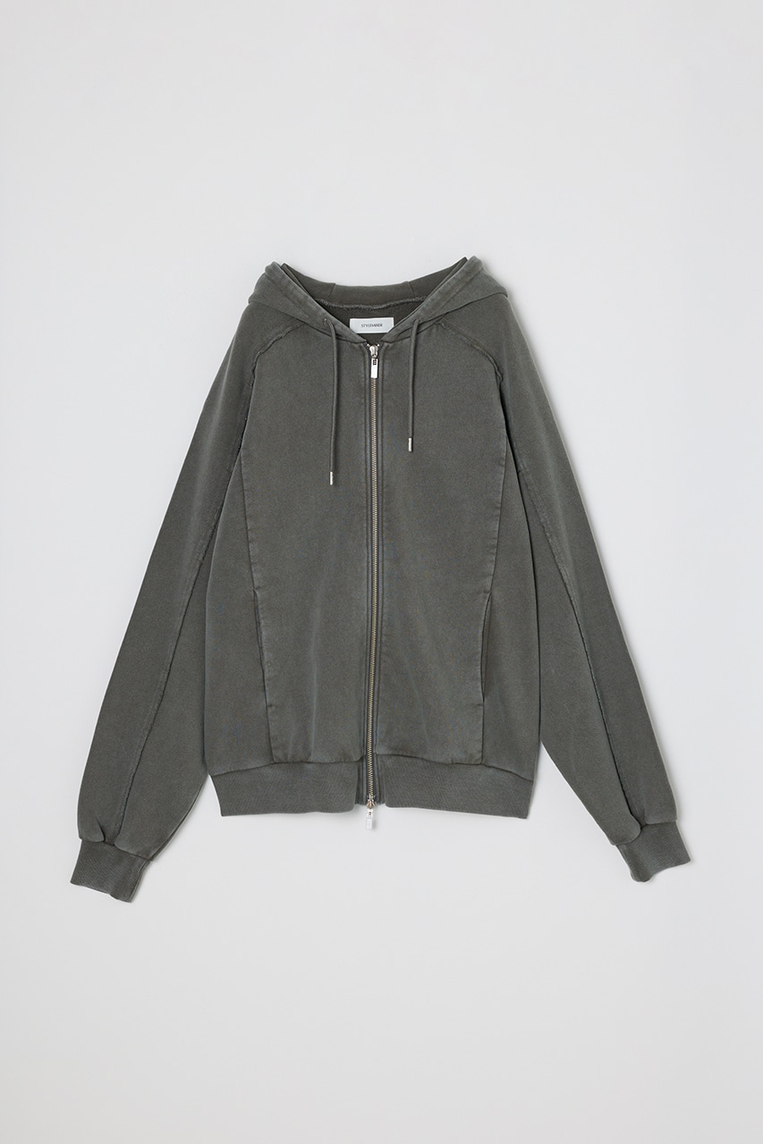 硫化染を施した厚みのあるコットン100%の裏毛ジップパーカー。ローエッジとフェードカラーで存在感のあるアイテムに仕上げた一枚。トレンド感のあるワイドシルエットがポイントです。ストレッチあり、透け感無し。