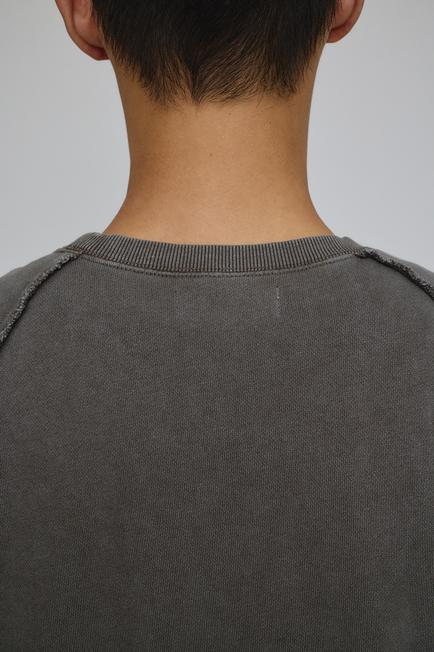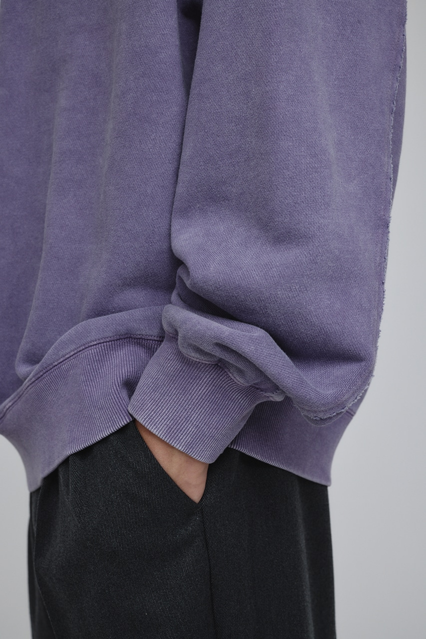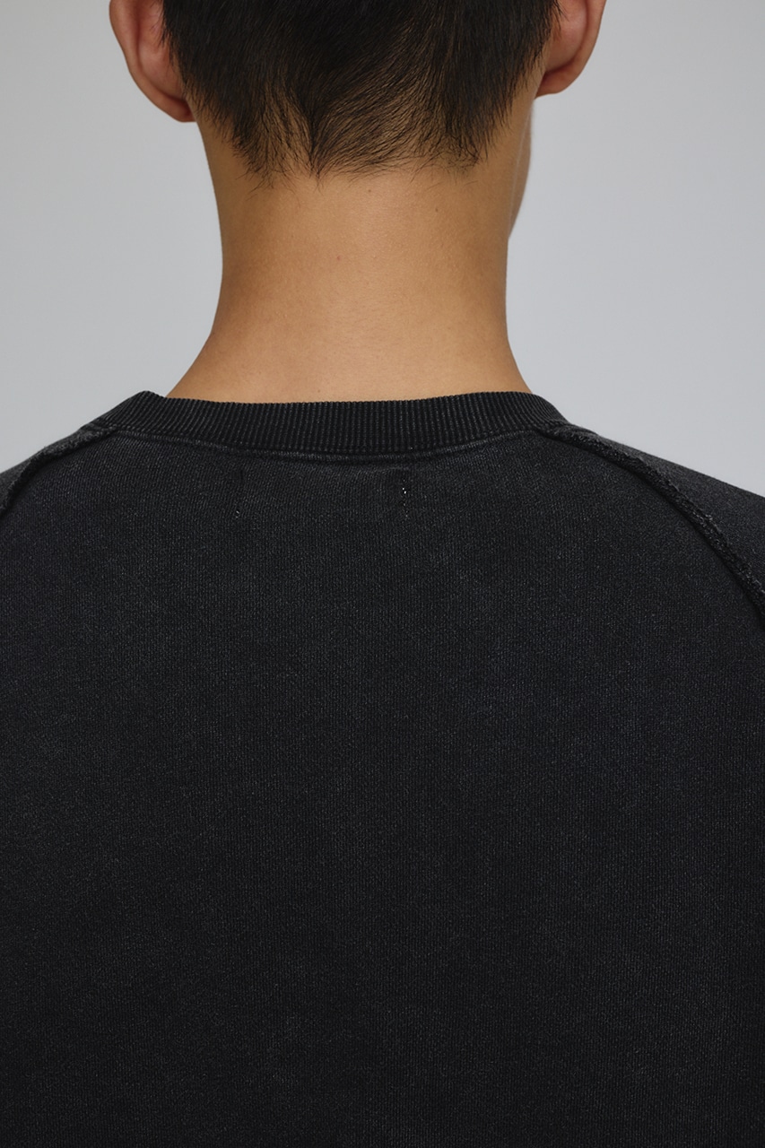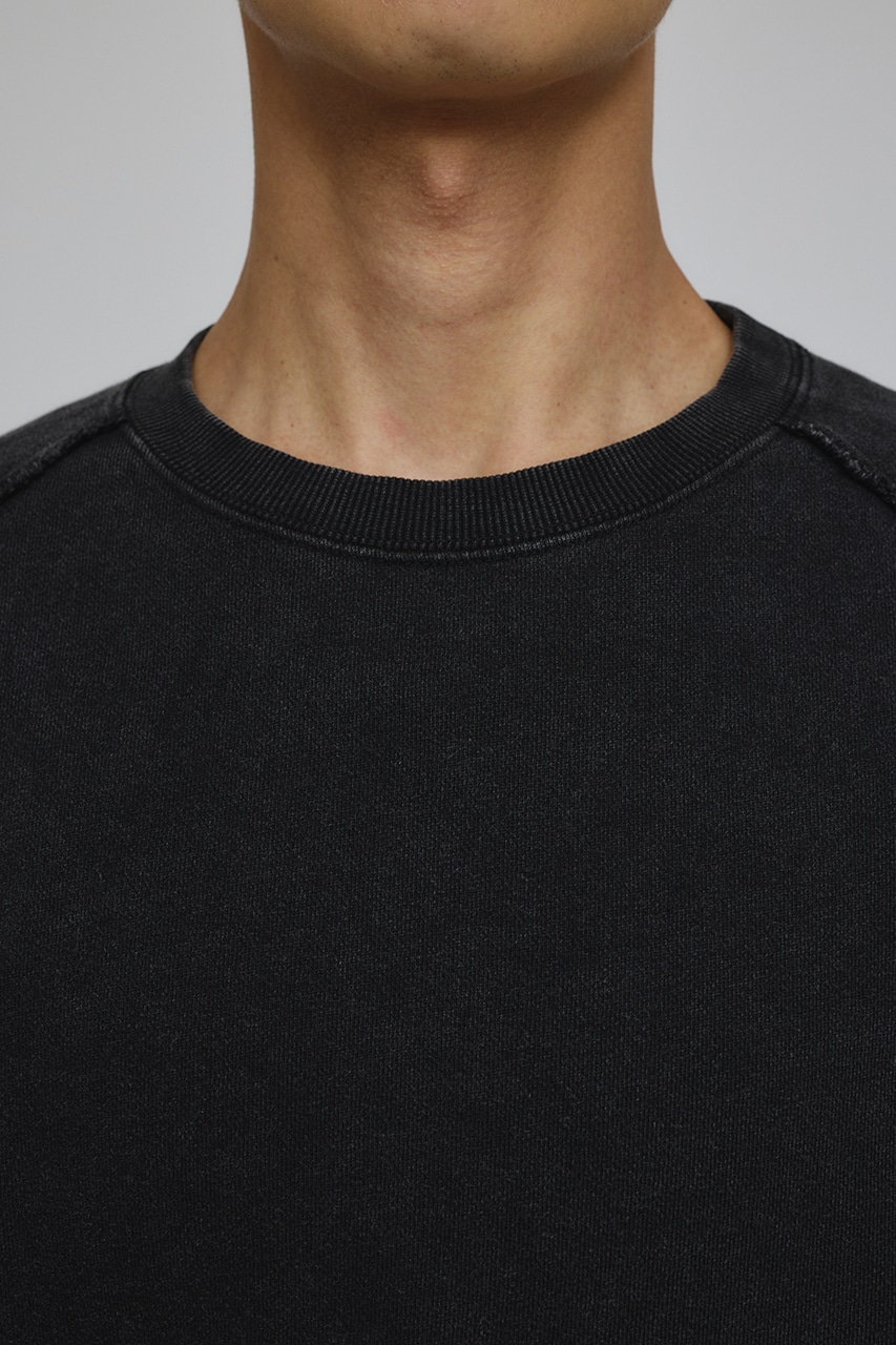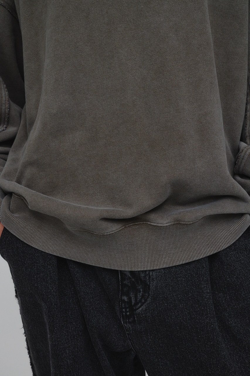 しっかりと厚みのある裏毛のスウェットを硫化染めした後、パウダーブリーチを施したフェード感のあるクルーネックスウェット。