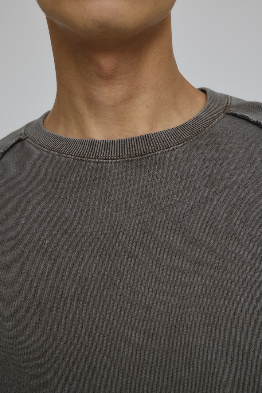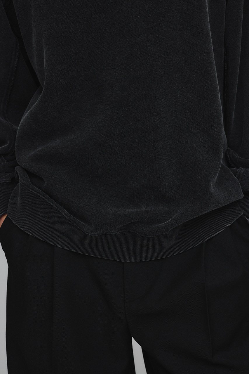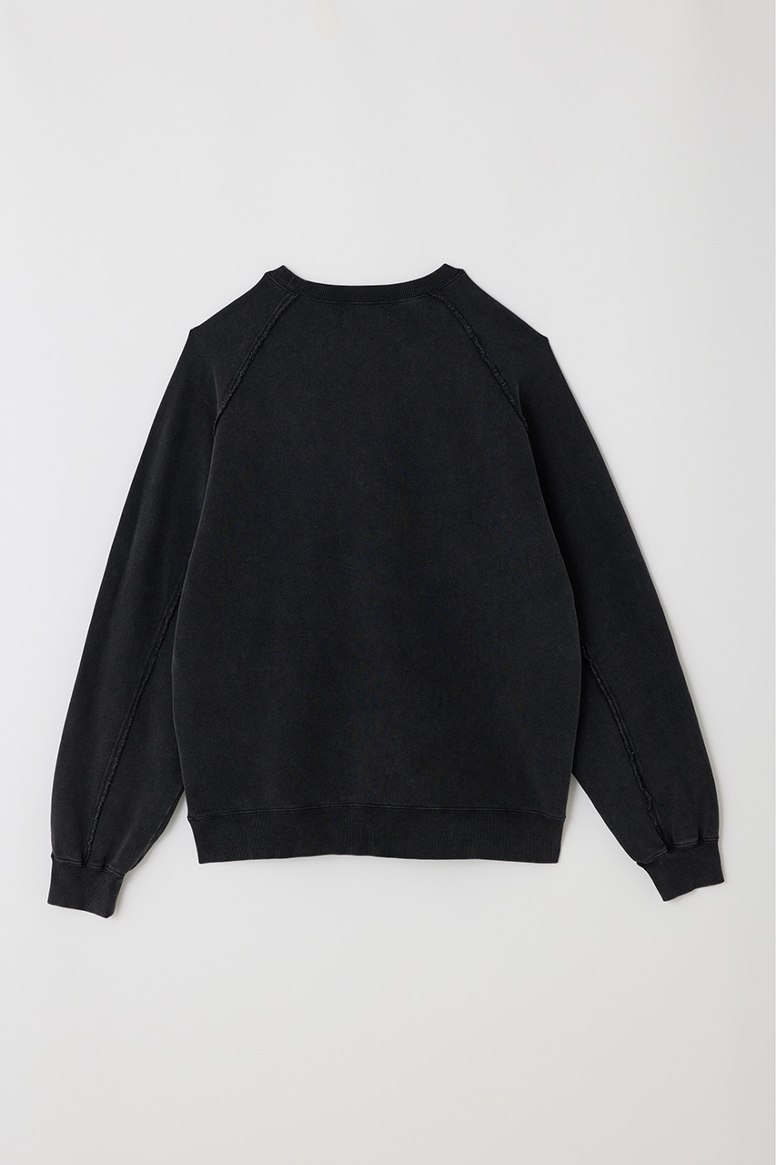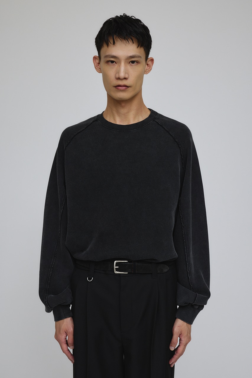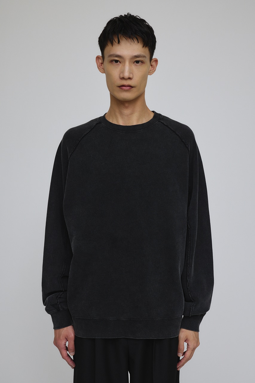 しっかりと厚みのある裏毛のスウェットを硫化染めした後、パウダーブリーチを施したフェード感のあるクルーネックスウェット。
