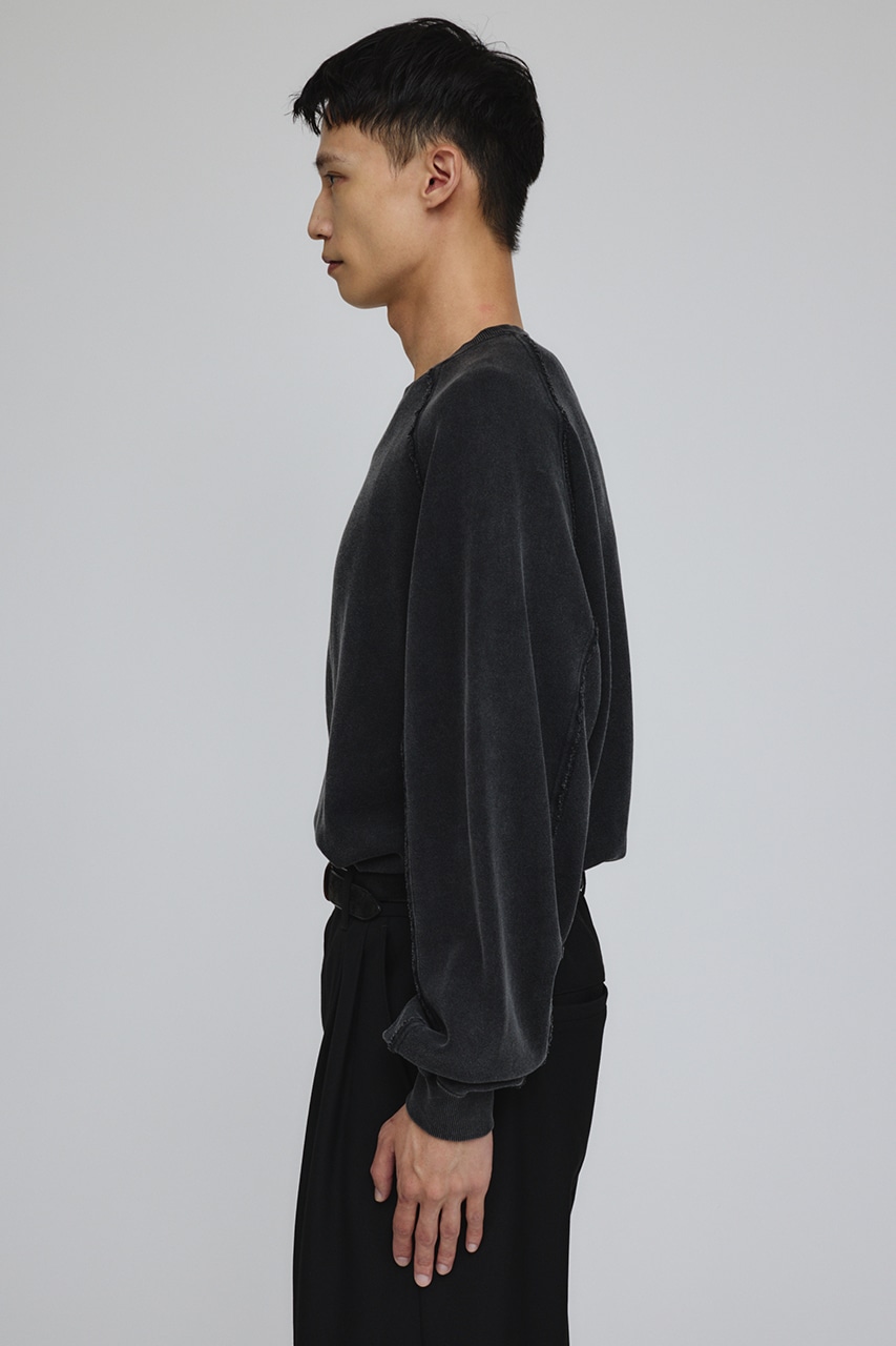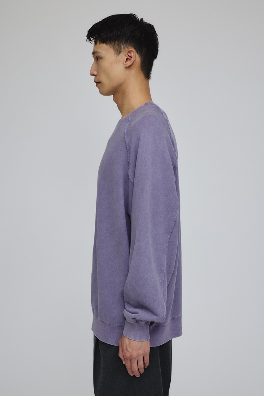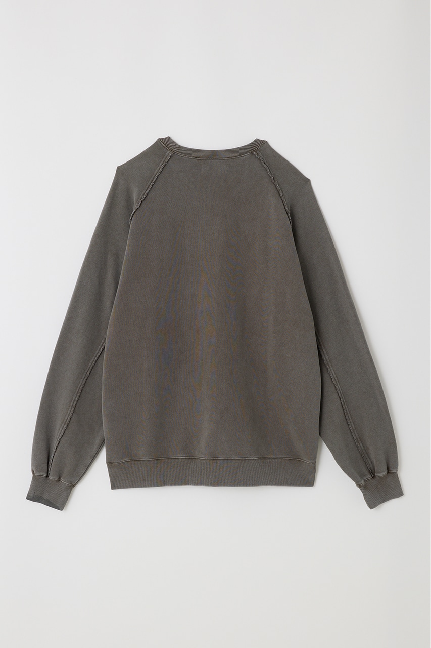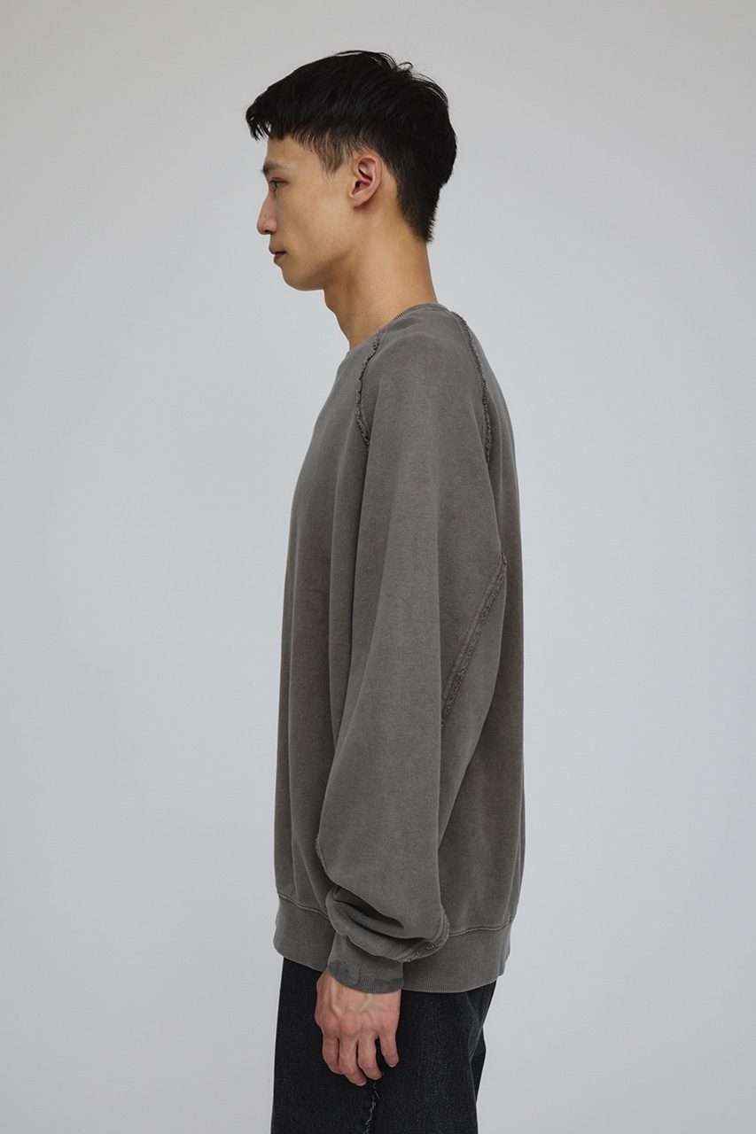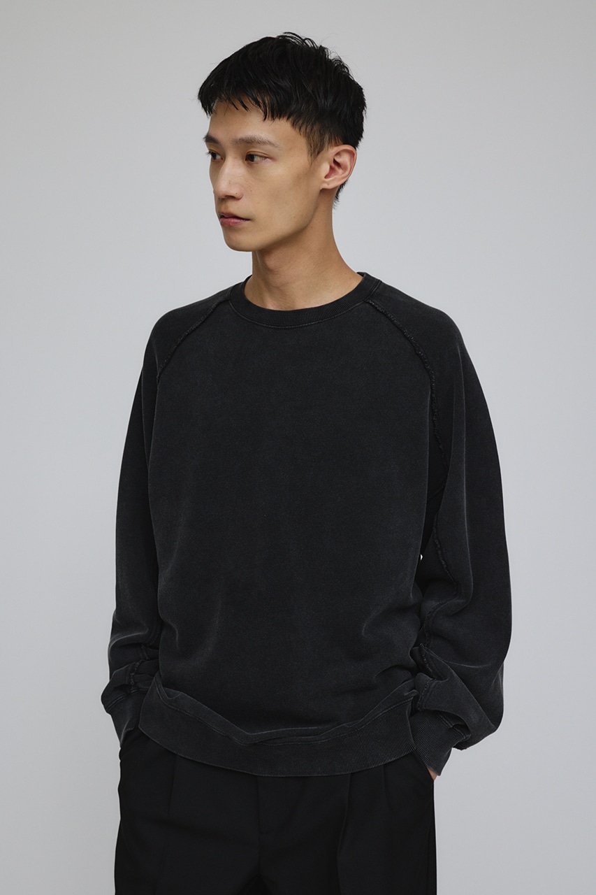 しっかりと厚みのある裏毛のスウェットを硫化染めした後、パウダーブリーチを施したフェード感のあるクルーネックスウェット。