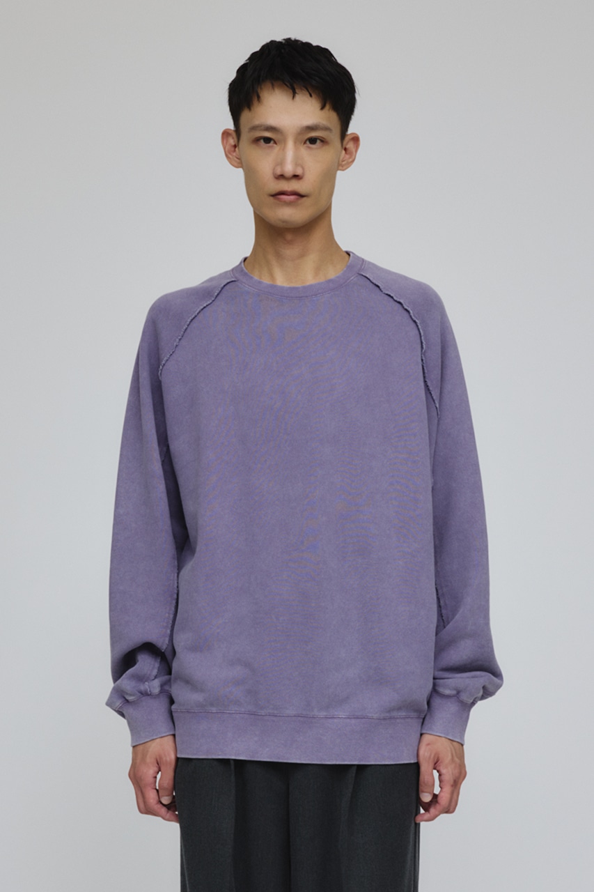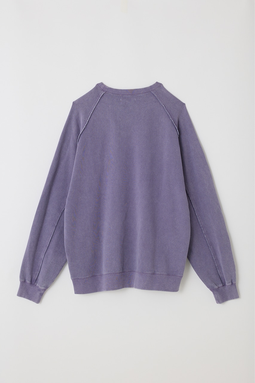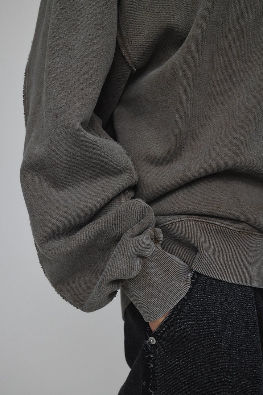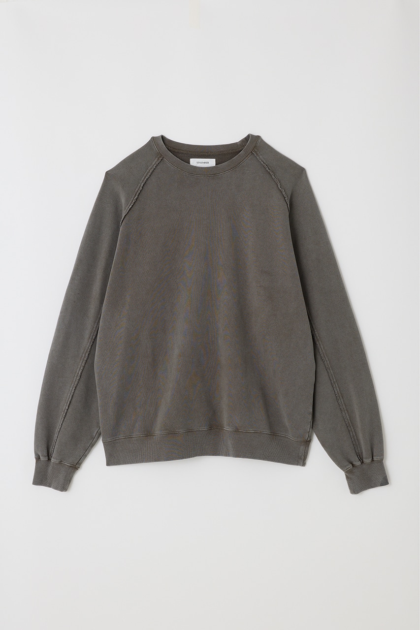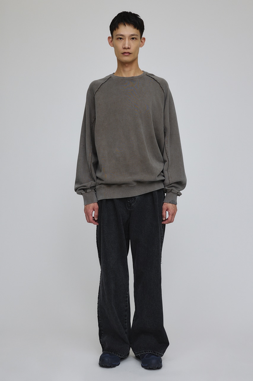 しっかりと厚みのある裏毛のスウェットを硫化染めした後、パウダーブリーチを施したフェード感のあるクルーネックスウェット。