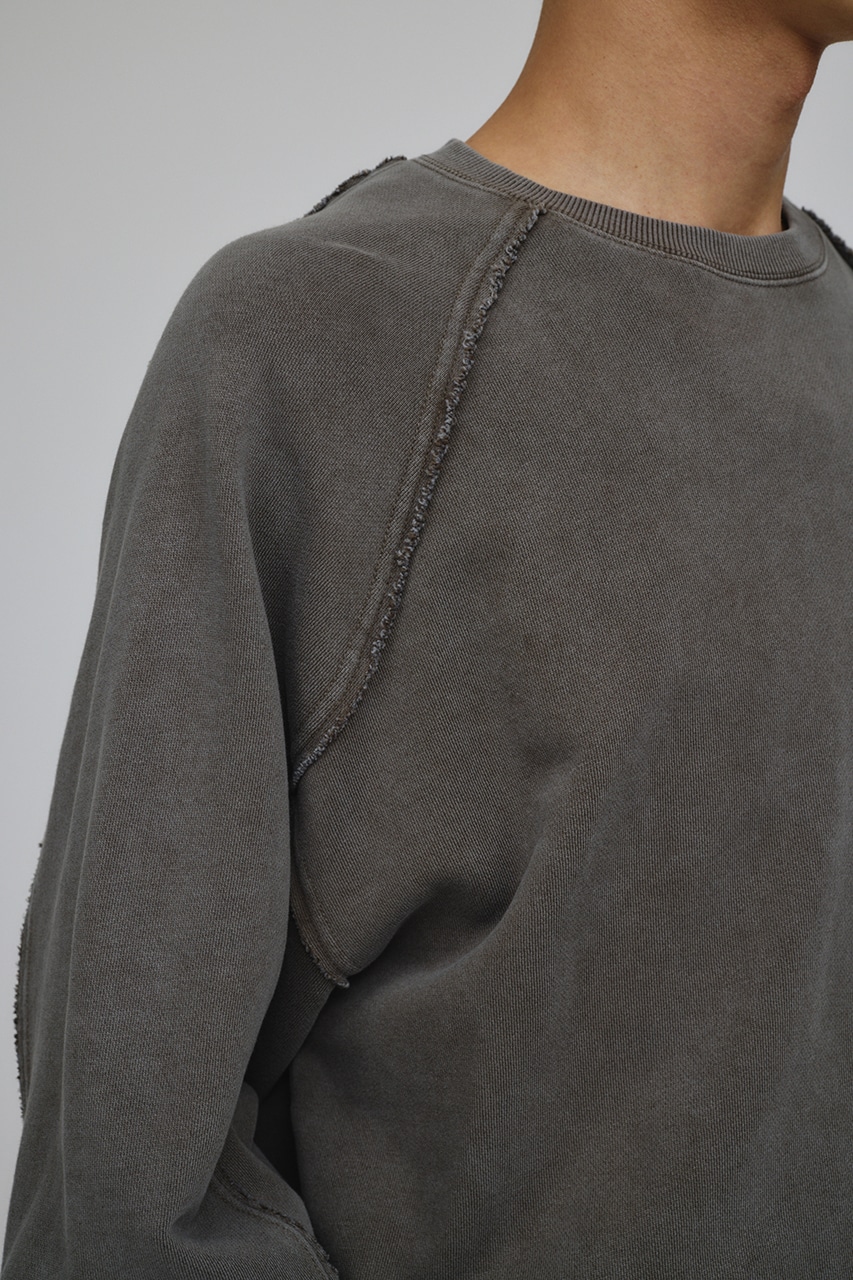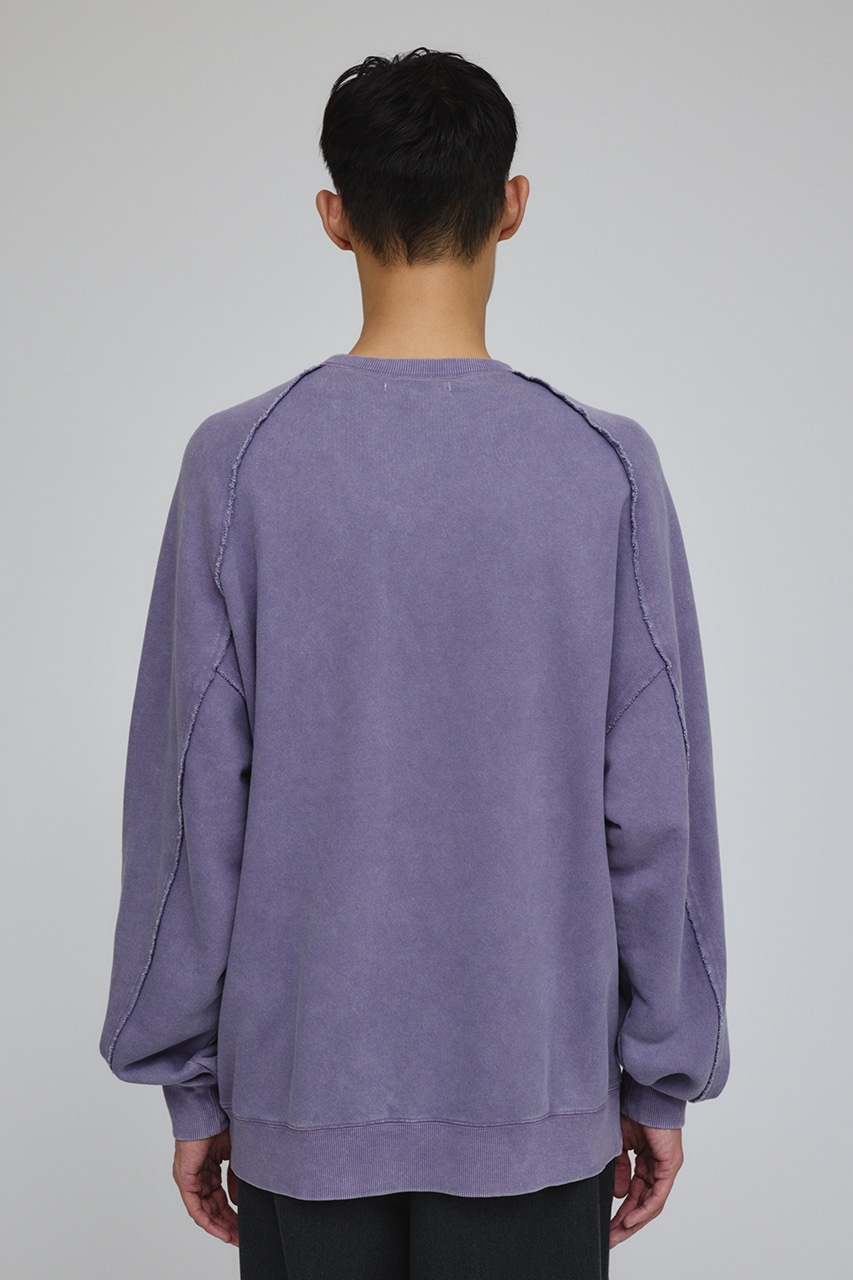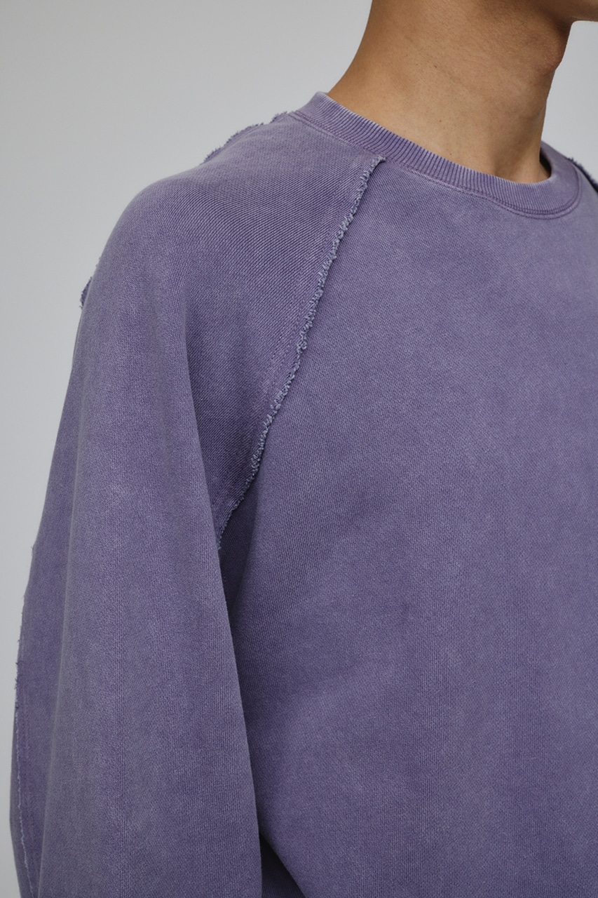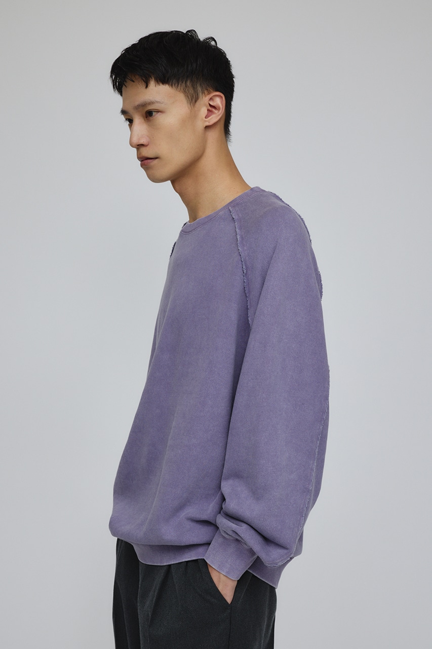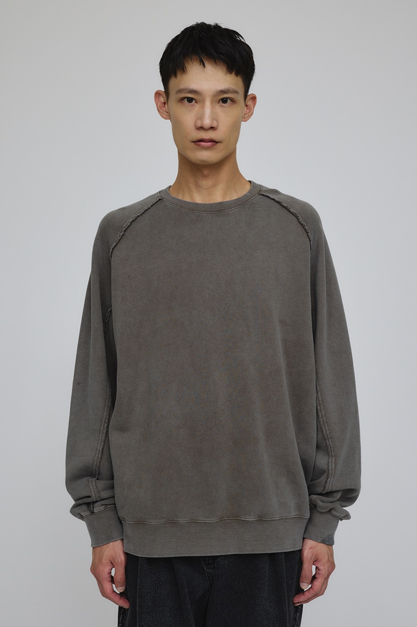 しっかりと厚みのある裏毛のスウェットを硫化染めした後、パウダーブリーチを施したフェード感のあるクルーネックスウェット。
