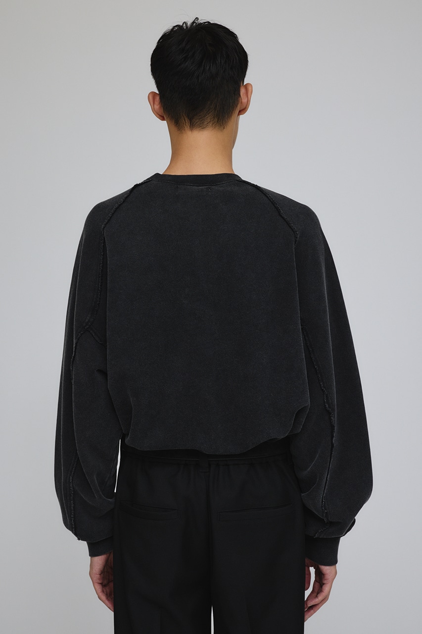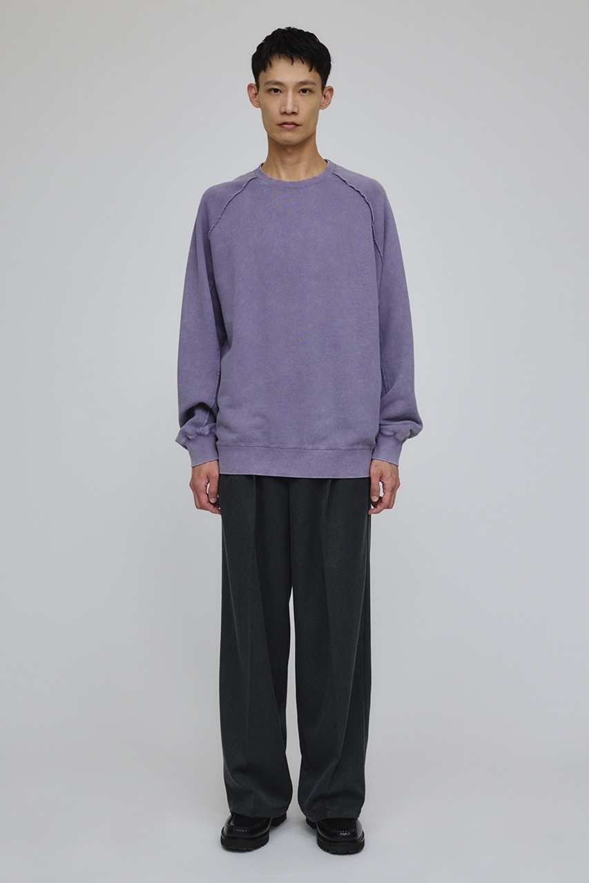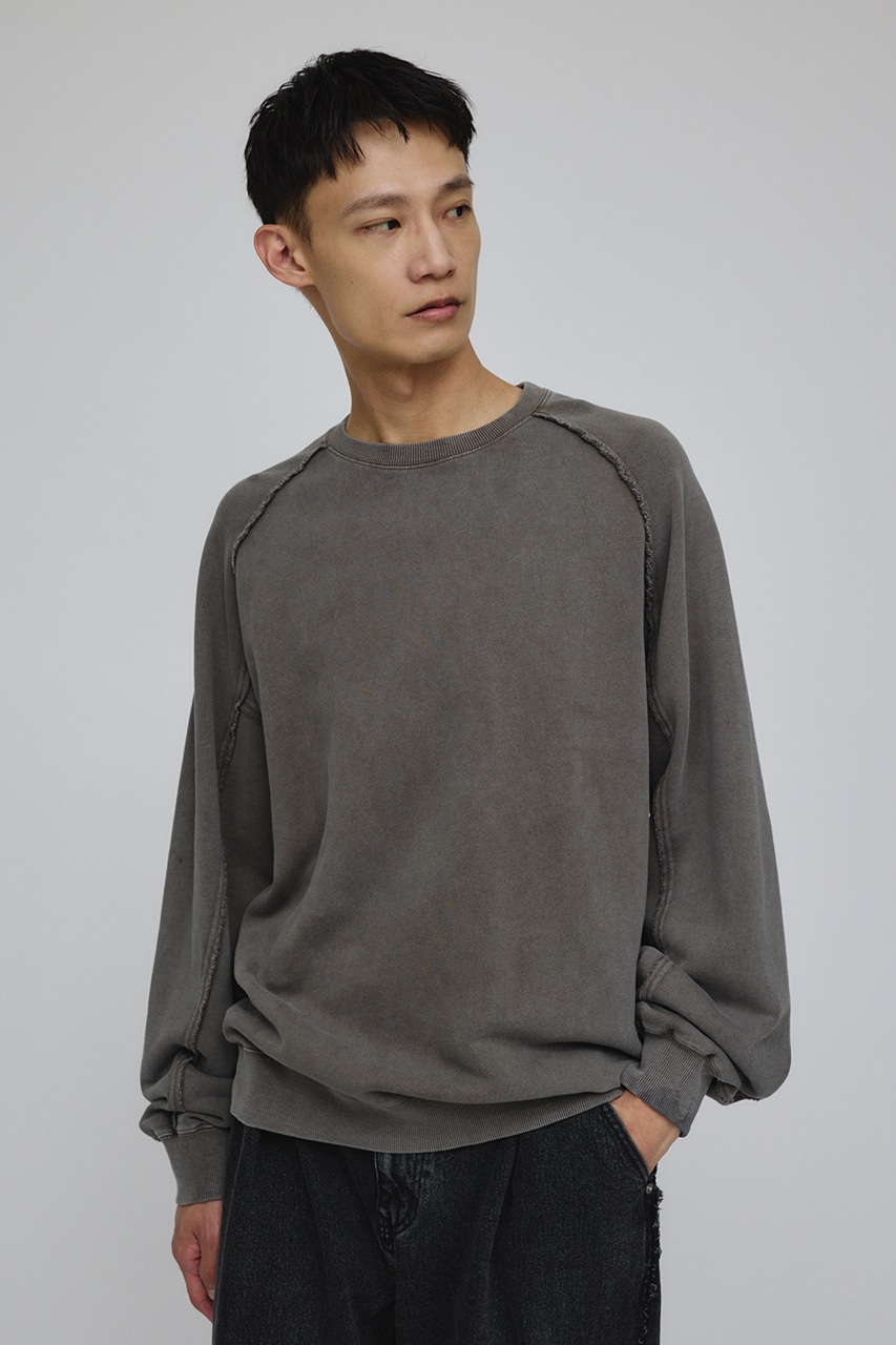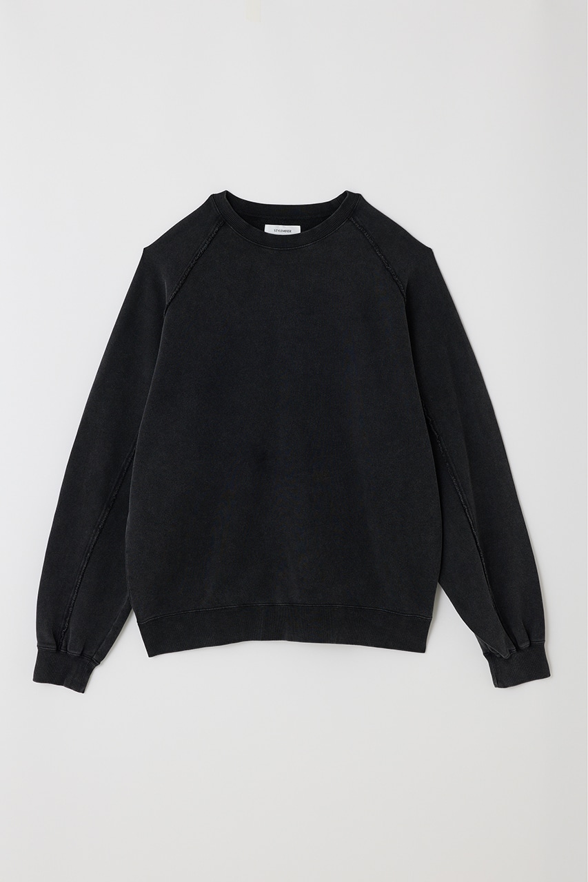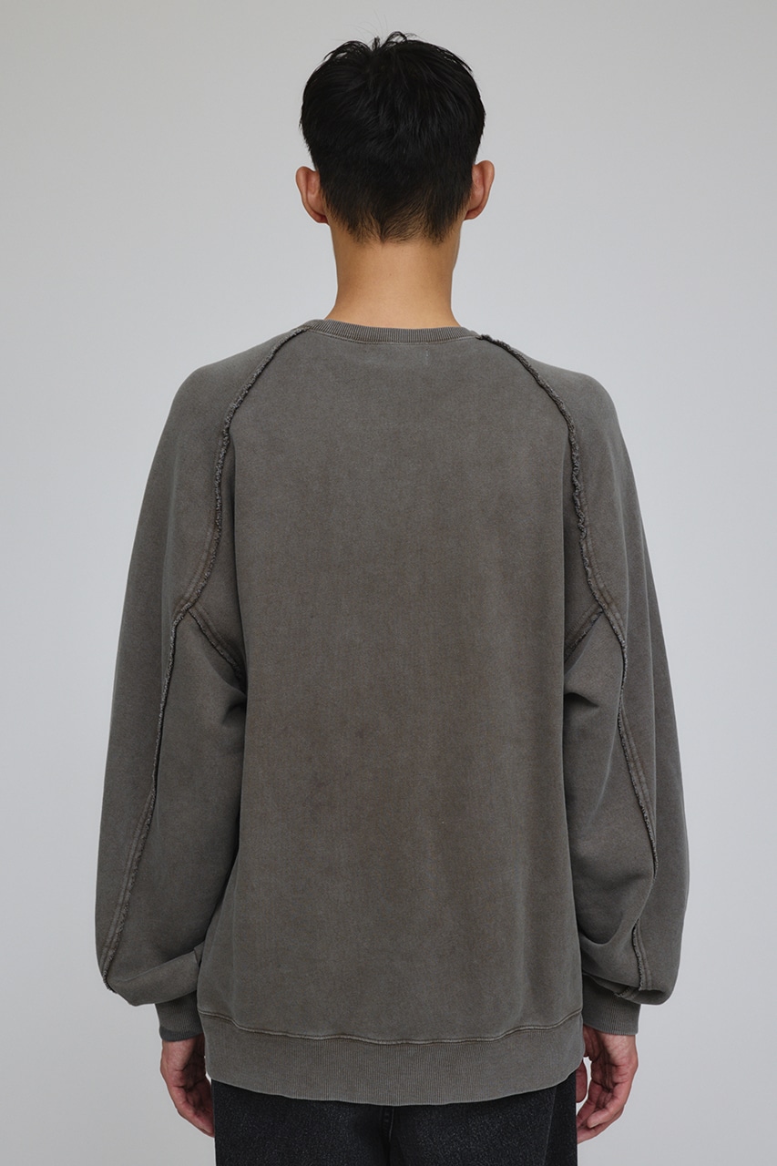 しっかりと厚みのある裏毛のスウェットを硫化染めした後、パウダーブリーチを施したフェード感のあるクルーネックスウェット。