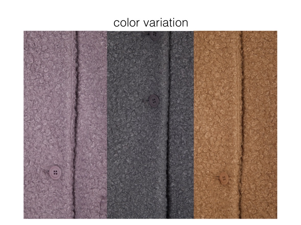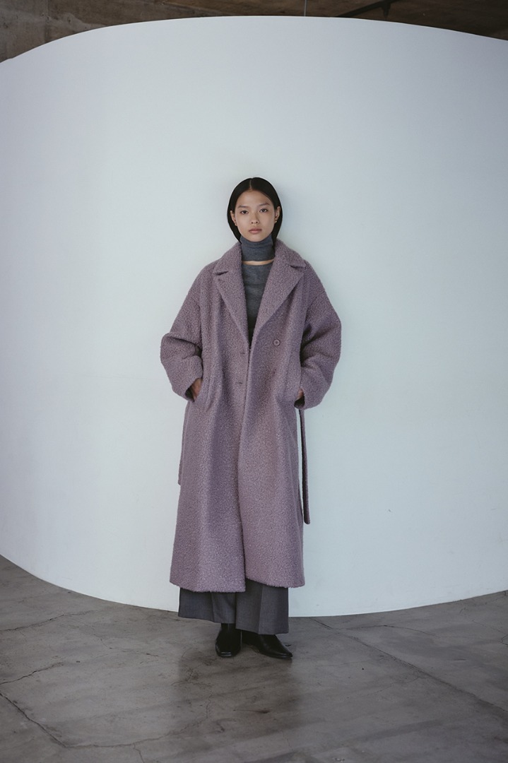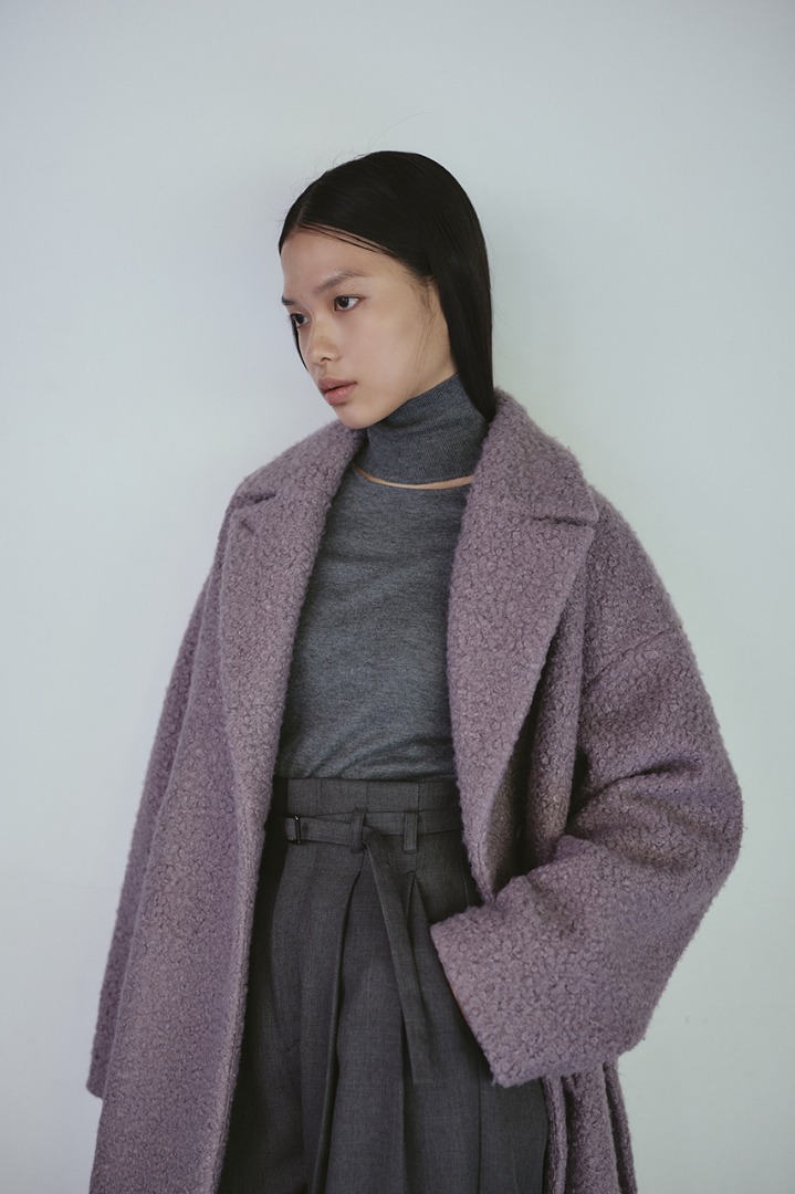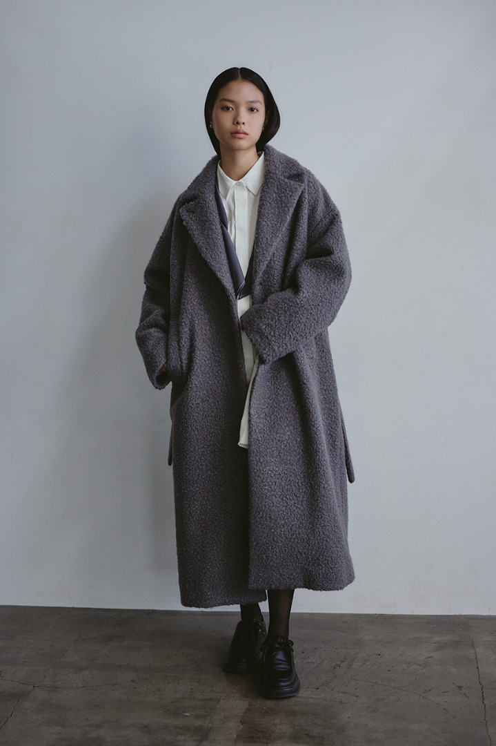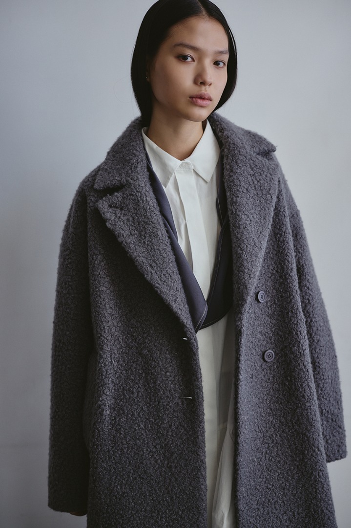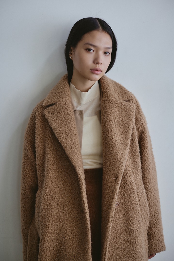 • くるんとしたカールブークレーが可愛いボックスシルエットのロングコート。