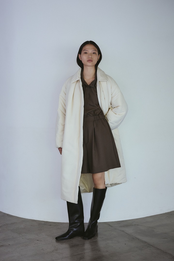 アップデティールでスタイルアップが叶う一枚です。シルエット変化が楽しめる共布ベルト付き。