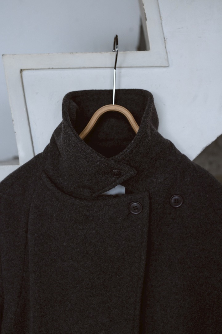 • 肩パットをしっかりと入れたパワーショルダーがマニッシュでモードな印象に導くPコート。